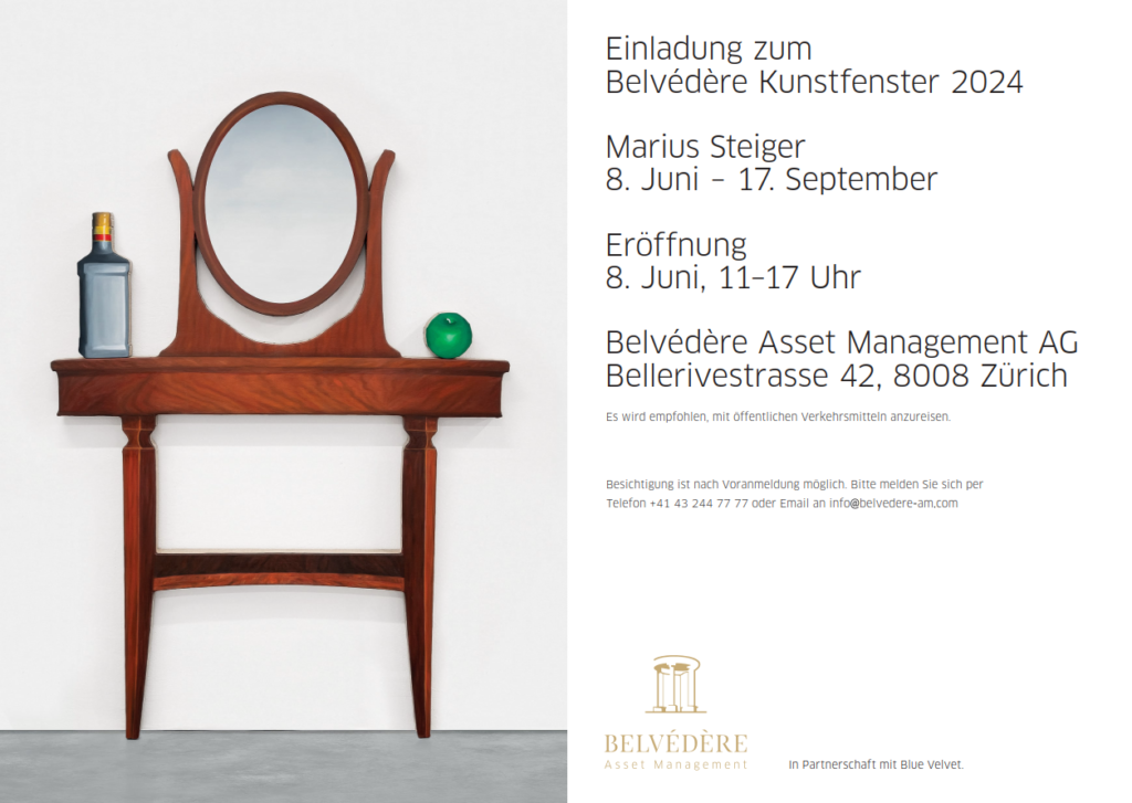 Marius Steiger hat die Ausstellung für uns konzipiert und neue Arbeiten speziell für unsere Räumlichkeiten geschaffen. Als Anbieter von umfassenden Dienstleistungen für vermögende Privatpersonen oder Familien, haben wir in den letzten Jahren auch die Kompetenz im Bereich Kunst ausgebaut und freuen uns sehr, mit der Veranstaltungsreihe «Belvédère Kunstfenster» unsere Expertise im Kunstmarkt mit Ihnen zu teilen.